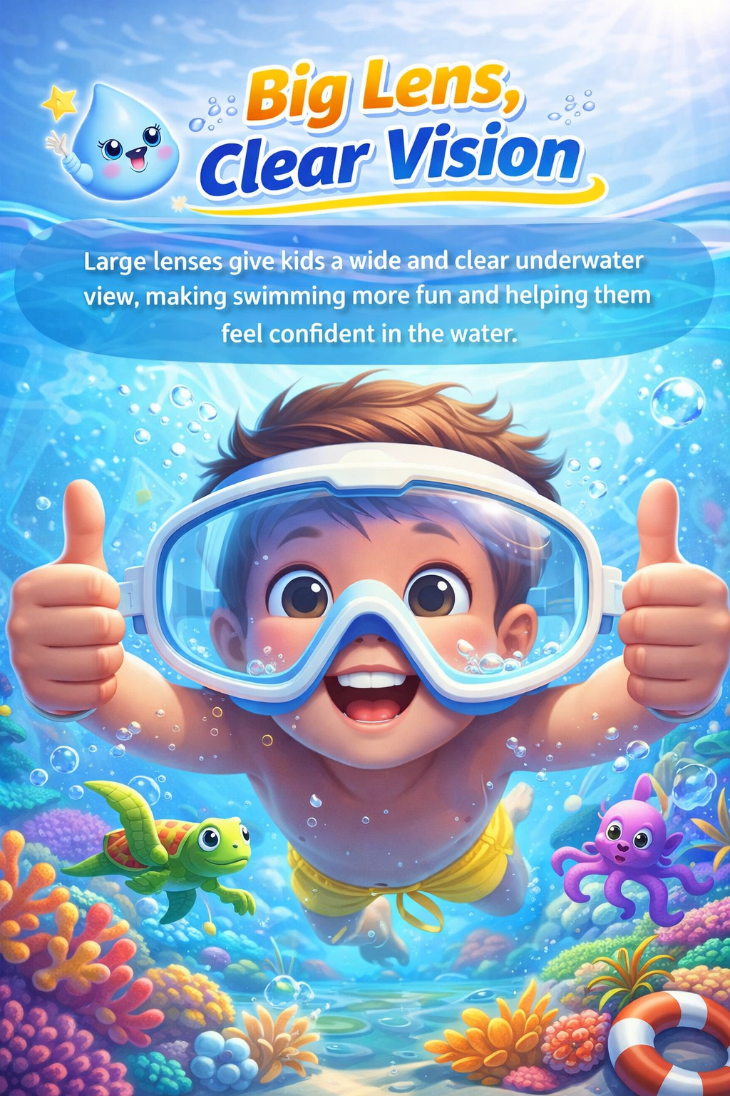 Large lenses give kids a wide and clear underwater view, making swimming more fun and helping them feel confident in the water.